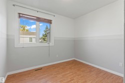 Desirable location in popular Brander Gardens, Riverbend. The setting is perfect. Walking distance to elementary and junior high schools. The condo backs onto a park and has easy access to walking/cycling trails in Edmonton's River Valley. Good connection due to the Whitemud and Henday. Well managed complex with newer windows, doors, shingles and fencing. Spacious LR with gas fireplace, sparkling new kitchen with appliances, ample eating area with extra cabinets to match kitchen. 3 bedrooms, updated 4 pce. bath up, updated 2 pce. bath on main, A/C, parking stall close to the unit, and a fenced private patio area. Great value in lovely park like setting.