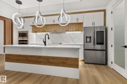 Welcome to this fully customized semi-detached home in the desirable Gorman community of Edmonton! The main floor showcases a soaring open-to-below ceiling in the living room, a gourmet kitchen complemented by a separate spice kitchen, and the added convenience of a bedroom/den with a full bathroom ideal for guests or multi-generational living. Upstairs, the spacious primary bedroom features a private balcony, walk-in closet, and luxurious 5pc ensuite. You’ll also find a versatile bonus room, two additional bedrooms, and convenient upstairs laundry. The finished basement offers a 2-bedroom suite, perfect for extended family. Enjoy outdoor living on the completed deck, with quick access to Anthony Henday Drive, grocery stores, schools, and nearby amenities. This home beautifully blends elegance, comfort, and functionality in a prime location, don’t miss it!