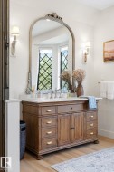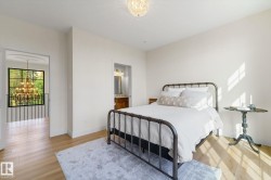 Visit the Listing Brokerage (and/or listing REALTOR®) website to obtain additional information. Located on prestigious Windermere Drive, this former Chizen & Co. showhome blends French and German architectural influences with curved metal roofs, copper accents, and a stone façade. Set on a massive 20,000+ sq ft lot, over 5,500 sq ft of refined living features 10-ft ceilings, a cast-carved stone fireplace, designer lighting, and a chef’s kitchen with La Cornue range, paneled appliances, and prep kitchen. The library with custom millwork offers a quiet retreat. The three-tiered primary bedroom includes dual baths, walk-in closet, and fireplace. Highlights include four bedrooms, 3.5 baths, den, hidden wine room, third-story loft with river views, and basement with golf simulator rough-in and arched bar. Outdoors, enjoy a covered entertaining area with grill, pizza oven, and landscaped grounds. A heated five-car garage completes one of Edmonton’s most architecturally coveted residences.