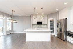 This stunning two-storey former Kimberley Homes show home is located in SW Keswick on the River. The main floor has a open living room with good size dinning space and stunning white cabinets kitchen with all 9' height ceiling, big quartz island, large pantry, backsplash & KitchenAid appliances. The dining area with door leading to the 26 * 14 composite deck with glass railing where you have summer BBQ and entertaining. The main level also has a bedroom room/office with closest, ready to be used as home office or kids study room. There's a 1/2 bath and mud room with sitting area sooner you enter from garage. Up the staircase to the great size bonus room, with three bedrooms, two baths and upstairs laundry room. Master en-suite has quartz countertop with his and her sink, oversized glass shower and tub and HIS and HER closest with organizer. It's close to the playground, schools and Anthony Hendy. Upgrades includes Softer water, Central Air-condition, Full house size Composite deck and Patio backyard.