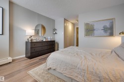 SPECTACULAR RIVER VALLEY VIEW from every window in this BRIGHT, COMPLETELY RENOVATED 1126 sq.ft. 2 bedroom 1.5 bathroom condo in TOP OF THE VALLEY conveniently located with transportation at your doorstep, close to unique shops, restaurants, coffee shops, Art Galleries, the Brewery District, the river valley walking/biking trails & quick access to the U of A. Spacious living room overlooking the river & access to the sunny south facing balcony. The gourmet kitchen is open to the living area with espresso color cabinetry, granite countertops, S/S appliances. The dining room has built-in cabinets. The primary suite is complete with a walk-in closet & a 2 piece bathroom. Spacious 2nd bedroom & a 4 piece bathroom with tile tub surround, new vanity & toilet. Laminate flooring throughout except for tile in the bathrooms. Large storage room. The condo fees include heat, water, power, laundry & underground parking. The building features a completely remodelled exercise room & lobby. Shows very well!
