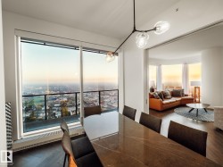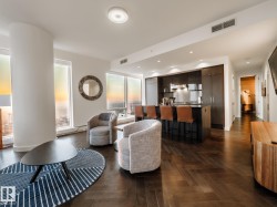 EXCLUSIVE 44TH FLOOR SUITE BOASTING PREMIUM DESIGNER FINISHES....SPECTACULAR PANORAMIC VIEWS....ARCHITECTURAL PERFECTION....HERRINGBONE LAID HARDWOOD FLOORS....WHEN NOTHING BUT THE BEST WILL DO...~!WELCOME HOME!~ First steps into your new LIFESTYLE; perfect foyer leads towards the HEART of the condo. Spectacular kitchen, high end appliances w/ built in wine fridge, and a warm modern flavour. CURTAIN WALL GLASS is everywhere * custom powered window treatments lets you decide on the birds eye city view or opulence exuding inside the unit! The living space falls nothing short of spectacular. The north wing has a dining room w/ views for days. Den/flex room on east side separates the primary bedroom; and yes it has a large walk through closet and proper spa/ensuite. What could be a third bedroom is on the west side of the unit( also well appointed!) all perched on top of the ice district, JW MARRIOT, comes w/ concierge, access to pool & ARCHETYPE gym, dinning, shopping & more. Second parking stall optional*