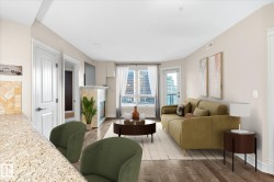 Exceptional 5th-floor unit in MERIDIAN PLAZA, offering upscale urban living in a beautifully designed building. This spacious open-concept suite features hardwood floors, 9’ ceilings, southwest-facing windows, a cozy gas fireplace, & garden door to the COVERED BALCONY. The kitchen offers granite countertops, sleek appliances, a breakfast bar, pantry, and an adjacent dining area. The primary suite includes a 3pc ensuite, plenty of storage, and a generous walk-in closet. The second bedroom, situated on the opposite side for enhanced privacy, also features a walk-in closet, balcony access, and is conveniently located next to the main 4pc bath. Enjoy in-suite laundry with extra storage, plus TITLED UNDERGROUND PARKING. Additional AMENITIES of this luxurious complex include a gorgeous Mediterranean themed atrium, fitness room, bike storage, mixer/event room with a full kitchen, & elegant owner’s lounge. Terrific location 1 block from Jasper ave & close to restaurants, shopping, transit, and the Ice District.