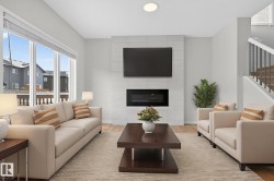 Welcome to this stunning duplex in the vibrant community of The Orchards, where modern design meets functional living. This exceptional 3-bedroom, 2.5-bathroom home boasts an expansive open-concept floor plan, perfectly complemented by oversized windows that flood every room with natural light. The south-facing rear yard ensures you enjoy consistent sunshine all day long—ideal for those who love a bright, airy atmosphere. Stay comfortable year-round with built-in A/C and enjoy the convenience of being within walking distance to the local pond and scenic walking trails. The exterior is fully landscaped, offering great curb appeal on a large, spacious, wide street that provides ample parking and a sense of openness. A standout feature is the potential for a side entrance, offering a seamless path to develop a future legal suite for guests or rental income. This home perfectly blends luxury, comfort, and long-term investment potential in one of the city's most sought-after areas.