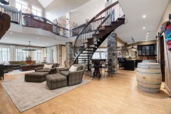 137 Wood Buffalo Way, Sophistication & Tranquility! Tucked away on an expansive 34,983. sq. ft. treelined estate, this extraordinary 9,700+ sq. ft. walkout bungalow. The tranquil backyard oasis, complete w/stone walkways, a sprawling fire pit area, & a covered rear deck with a rejuvenating hot tub, offers the perfect balance of elegance & relaxation. Entering this home you're welcomed by an awe-inspiring foyer with towering vaulted ceilings that set the stage for the exquisite interiors beyond. Luxury hand-scraped hardwood floors that run throughout the main level to the dramatic floor-to-ceiling stone fireplace in the lower level living room, which acts as the heart of the home. The gourmet kitchen is a culinary masterpiece, anchored by an oversized island, it features professional-grade appliances. The black granite countertops, farmer’s sink & the abundance of custom cabinetry add an extra layer of sophistication. Adjacent, a thoughtfully designed butler’s pantry features a built-in freezer, additional sink, and plentiful storage. From the kitchen, step out to the covered deck, where a custom outdoor BBQ kitchen awaits, complete with radiant heaters, intricate stonework, glass railings, and soft spotlights for atmospheric evening dining. The dining room, a showpiece of refined luxury, boasts vaulted ceiling and a striking antler chandelier, & a capacity to seat 10+ guests.. This luxurious space is complemented by a spa-inspired ensuite bathroom. Indulge in the soaker tub, rejuvenate under the rainfall shower, or prepare for your day at the double vanity with a designated makeup area. The primary bedroom also offers an expansive custom walk-in closet with built-in cabinetry. While the spacious bedroom above the garage, offers vaulted ceiling, built-in bar, & elegant 3-piece bathroom, provides a private guest or family suite. The west wing, two additional bedrooms share the main level, each designed with attention to comfort & detail. A well-appointed 4-piece bathroom and a large storage closet offer convenience, while the spacious laundry room is as functional as it is stylish, featuring ample closet space, + built-in bench. This wing also provides access to the second heated garage, 25x40 equipped with floor drainage + 2-pc. bathroom + rear signal overhead door for easy drive-through access. This estate is an entertainer’s paradise. The recreation room offers cork flooring and anchored by large granite-topped bar, equipped with a built-in dishwasher, fridge, microwave, and kegerator. with a pool table, multiple TVs, & an integrated Control 4 home automation system. The lower level also boasts a sophisticated wine cellar, a state-of-the-art gym, & an immersive theatre room. For the sports enthusiast, the Oilers-themed family room, designed in the team’s iconic colors & complete with a custom rink, offers a playful yet refined retreat. With its unparalleled attention to detail, this estate offers a lifestyle of both lavish entertaining & peaceful solitude.
