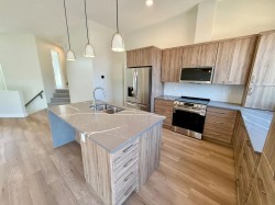 Welcome to this stunning brand new home by Hall-E-Wood Construction, offering over 2,200 sq. ft. of beautifully finished living space in a smart modified bi-level design. Finished with quality materials throughout, this home is ideal for families or anyone seeking style, comfort, and functionality. Step inside to find luxury vinyl plank flooring on the main level, a bright open concept living space, and the kitchen is complete with quartz countertops and stainless steel appliances. The spacious deck and fully fenced yard make it perfect for entertaining and relaxing outdoors. The main floor primary suite offers a walk in shower, make up vanity, and ample closet space. Two additional bedrooms and another full bath are located upstairs. The fully developed basement adds even more living space, featuring a large family room, 4th bedroom, another bathroom, laundry, and the comfort of in floor heating. This property boasts a 24 X 24 heated attached garage, massive concrete driveway, and a huge RV parking pad complete with a sani dump. With quick possession available and new home warranty included, this turn key home is move in ready and built to impress.