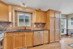 Welcome to The Springs at Bridgeport. This 55+ community home is a spacious bungalow filled with natural light, featuring granite countertops and hardwood floors throughout. The kitchen offers ample cabinetry, an oversized island, and stainless steel appliances. A garden-door leads from the breakfast nook to the backyard deck, a private oasis. The dining area shines with extra windows for radiant entertaining. The primary bedroom includes a walk-through closet and a 3-piece ensuite. A second main-floor bedroom serves as a guest room or office. The finished basement adds a 3rd bedroom, a large recreation room with a gas fireplace and wall unit/Murphy bed, a 4-piece bath, and a laundry area with upscale washer/dryer and extra storage. Central A/C and vacuum. The back deck features a smoker and fire pit for evening gatherings. Heated, finished double garage. Pride of ownership.