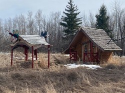 This great acreage is just north of Eaglesham, it is 9.98 acres. It is fenced, with gas A power on the property. There a 32 x 69 , pole shed with 14 ft closed in on the end, and 35 x 65 wired and insulated metal arch rib shop. There is no water and sewer, but there is a cute outhouse. There is an older 14 x 68 mobile home with a huge addition, 31x24.The addition has gorgeous hardwood floors, and a pellet stove. There’s a double detached garage, and a covered deck that wraps on two sides. This property will take a bit of cleanup, but can be amazing. The owners will be keeping the c cans, metals, furnishings, tools, vehicles and parts, and the wishing well.