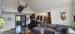 Check out this 1/4 section down the road from the North Saskatchewan river! This RTM built by Nelson Homes known as "The Fairmont" is a lovely two-storey with vaulted ceilings in living, dining and kitchen areas. The home plan features a large primary bedroom with a great ensuite, laundry, 2 piece bath and den all on the main floor. Upstairs features two bedrooms, 4 piece bath and overlooking down to the open grand main. Basement has two bedrooms, bathroom, storage/utility, rec area and living room on a ICF foundation. An absolute MASSIVE heated and insulated shop with extra power, 2 single doors and a HUGE RV overhead door with upstairs mezzanine and workshop-storage room. The feature list in the yard extends from two tiered deck, chicken coop, enclosed hobby farm lean-to, garden spot, flower beds, firepit, 3 fenced pasture areas and GIANT dugout. Roughly 140 acres cultivated farm land. ALL THE WILDLIFE AND COUNTRY LIVING IN YOUR OWN BACKYARD!