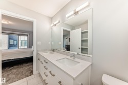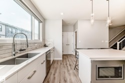 Extremely well-maintained 2-storey home in sought-after Emerald Hills, just steps from all amenities! This Paris II model by Cantiro Homes offers charming curb appeal with a front veranda and BBQ gas line. Inside, the welcoming foyer opens to a stunning living room with soaring vaulted ceilings, highlighted by an electric fireplace with a floor to ceiling tile surround. The bright kitchen overlooks the living room and features stainless steel appliances, a central island, and quartz countertops. Upstairs, the spacious primary suite boasts a walk-in closet and 4 piece ensuite. Two additional bedrooms and the convenience of upper-level laundry complete the Upstairs. The basement provides a large flex space perfect for a home office, gym, or extra storage along with direct access to the double attached garage.