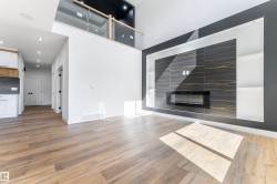 BACKING TO PARK || Gorgeous Fully Upgraded Home with Double Garage in Stony Plain! This custom-built beauty is a dream come true! The main floor features a versatile den/office (could be used as a bedroom) with stunning feature wall, a half bath, and a chef-inspired kitchen with a unique center island and spacious pantry. Extended Kitchen. The Open to above living area boasts a striking custom wall, creating a stunning view, while the dining room opens to a deck, perfect for entertaining. Upstairs, you'll find a spacious bonus room with beautiful feature wall & fireplace. A huge primary bedroom with stunning ceiling design & own private balcony overlooking park, a luxurious 5-piece ensuite with a walk-in closet. Two more bedrooms with feature wall in each & closet in each bedroom. Common bathroom on upper level. For added convenience, the laundry is located on the second floor. The unfinished basement with SEPARATE ENTRANCE is full of potential for your personal touch.