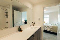 A bright 3-storey, two-bedroom, two-bath townhome designed for modern living. (1,284 sqft via Strata Plan + 414 sqft garage) Unit 13 at Gardner by Mosaic, the entry level offers a versatile den ideal for a home office. Upstairs, soaring 10-foot main-floor ceilings, oversized windows, and light finishes make theopen living space feel airy and inviting. The kitchen impresses with sleek grey cabinetry, quartz counters, stainless steel appliances, and an oversizedisland for casual meals or entertaining. Two spacious bedrooms share a stylish Jack-and-Jill bathroom. Side-by-side double garage and full-lengthdriveway — 4 PARKING SPOTS. Pet-friendly Gardner Park, with easy access to Highstreet shops and Highway 1, combines comfort, convenience, and one of the best values in the complex.