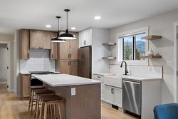 This stylish and substantially updated 4 bedroom home sits on a flat 0.23-acre fenced lot in a desirable neighbourhood. The main floor features a modern kitchen with stone countertops, new appliances, updated fixtures, & custom lighting—flowing into the bright dining & living room area with access to the new permitted deck (railing to be completed). Also on this level is the oversized primary bedroom with large closet & elegant ensuite bathroom, a second bedroom or office, & a convenient 2-piece powder room. The walk-out lower level features an expansive foyer, two additional good sized bedrooms, a brand-new full bathroom, spacious laundry area with a new washer & dryer, & ample utility/storage space. Extensive upgrades include: new insulation with vapour barrier, new electrical and plumbing, new drywall & paint, new flooring, new windows, updated doors & hardware, new furnace/heat pump, soffits, stucco, improved drainage, landscaping, new fencing with gate, & a new driveway. Roof approx. 5 years old. Carport plus extra parking complete this move-in-ready home. This home shows like new inside & out, making it a must see! On town water system. Call today for a private viewing or full information package. Quick possession possible!
