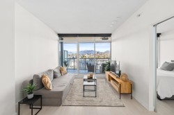 Beautifully designed North facing condo with open floor plan, high ceilings and floor to ceiling windows. Modern luxury with an abundance of thoughtful features and amenities. The kitchen is equipped w/stainless steel Bosh gas stove and appliances, ample storage w/built-ins, pull outs and soft close cabinets. Access to the 200SF heated & covered patio from both the living area and the bedroom. California style closets with LED lighting. Smart thermostat. A/C. Shaded roller blinds throughout. Bright and modern bathroom w/storage in the vanity. 1 parking w/EV charger and 1 large locker #888. Amenities include, gym, karaoke lounge, pingpong, pool table, indoor&outdoor lounges, study, touchless carwash and more! Minutes to Amazing Brentwood Mall, transit and all the necessities.
