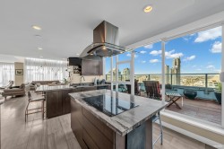 South-West corner Penthouse with HEATED Italian Travertine-Limestone floors! This bespoke 2-BD , 3-BATHROOM Executive Condo offers a private Urban Oasis right in the heart of The AMAZING BRENTWOOD. Sophistication & luxurious finishes abound exuding a pleasant easy-going, relaxed atmosphere featuring dimmable Halogen lighting throughout, marble kitchen counters, custom built-in millwork & cabinets, fully concrete eastern wall w/floor-to-ceiling decorative stone, custom pattern-cladded glass doors + large irrigated patio. Perfect for enjoying long summer sunsets with beautiful mountain, ocean & Lions Gate bridge views! This unit offers ideal Lock-n-Go lifestyle steps away from the European inspired Brentwood Plaza, shops, cafes, entertainment & restaurants right at your doorstep!