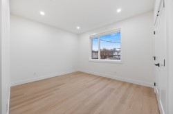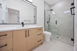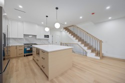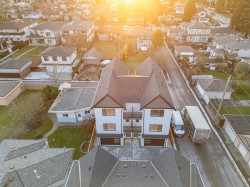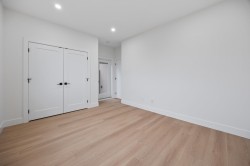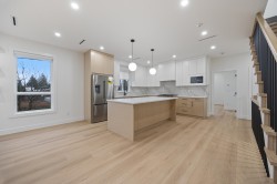 Beautiful 3-level, 2,607 sq. ft. home with a bright, open-concept layout. Main level offers a gourmet kitchen with gas range, quality finishes, and a welcoming living area with gas f/p, plus a second primary bedroom with ensuite and 2-pce powder room. Upstairs features three generous bedrooms, including a primary suite with ensuite and walk-in closet. Ground-level entry includes a large rec room, separate bedroom (no closet), full bathroom, roughed-in laundry, and separate entrance, ideal for extended family. Comfort features include heat pump/air conditioning, HRV, and radiant hot water gas heating. Includes a large attached garage and fenced yard. Prime location near Highgate Mall, Metrotown, transit, recreation centres, Deer Lake Park, and easy highway access. 2-5-10 New Home Warranty.