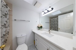 In the heart of Edmonds, rarely found upper quite inside unit facing its own private park with beautiful tree views. Spacious 2 bed 2 full bath townhouse with a newly completed full renovation—move-in ready! Enjoy new bathrooms and an open kitchen with marble counter, new cabinets, lighting, and under-cabinet lights, plus fresh paint, new doors, flooring, and newer appliances (2023). Skylights add gentle natural light. A/C on main, in-suite laundry, 1 parking & storage. Walking distance to Edmonds SkyTrain, schools, parks & Highgate Village. Open House Sat&Sun 2-4
