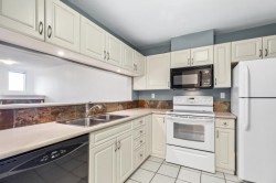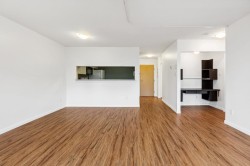 This huge 801sf 1 bedroom unit has updated laminate floors throughout the foyer, the living room and the bedroom. The spacious living room has three ceiling lights, a gas fireplace, and access to the large covered balcony spanning the entire width of the condo which offers a lovely view of mature evergreens and the Highgate skyline. The kitchen comes with stone countertops, 2.5 rows of white cabinets, a pass-through window to the dining area and ceramic tiled floors. The hallway closet has been converted into a work station with a built-in desk and built-in shelves. The huge bedroom is big enough for a king set plus work stations and has access to the balcony. Rent includes insuite laundry, one locker and one underground parking stall.