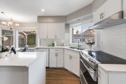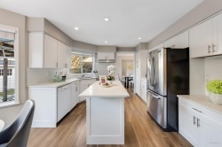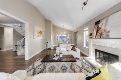 This beautifully maintained home offers space for the whole family and is just a short walk to Holly Elementary. The functional layout features a bright living and dining room with vaulted ceilings, leading to an open-concept kitchen with white shaker cabinets, quartz countertops, and a subway tile backsplash. The cozy family room boasts custom built-ins and a gas fireplace. Upstairs, you'll find a large games room, two bedrooms, and a spacious primary suite with a walk-in closet and ensuite. Additional highlights include a den (or 5th bedroom), a double garage, laminate flooring, and a private backyard perfect for relaxing or entertaining.