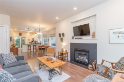 RARE! Welcome to Eagle Heights Estates! This like-new 2-bed, 2-bath home (built 2012) offers bright, comfortable main-level living with a walk-out basement ready for your finishing ideas. Enjoy an impressive EnerGuide 80 rating, open-concept living, and a cozy gas fireplace. The modern kitchen features granite countertops, an eating bar, stylish cabinetry, and direct access to a covered private deck overlooking peaceful green space — the perfect spot for morning coffee or evening relaxation. A charming bay-window dining nook adds warmth and character. The low-maintenance yard is beautifully landscaped and maintained by the strata, so you can simply relax and enjoy. Additional features include pot lighting, a high-efficiency heat pump, built-in vacuum, irrigation system, and an oversized single garage. Tucked in a quiet and exceptionally managed enclave surrounded by nature yet close to town amenities, this home offers comfort, convenience, and quality living in one exceptional package!