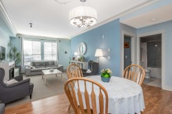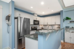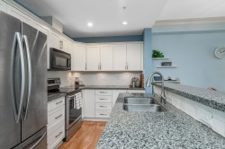 Welcome to The Sonnet! A well-maintained gated building with very low strata fees. This ground-floor, south-facing 1-bedroom + flex space unit offers abundant natural light with tall windows, 9 ft ceilings, and crown moulding. The bright, open-concept kitchen features upgraded appliances and a new sink. The bathroom was fully renovated in 2021 with a new vanity, soaker tub and in-floor heating. The spacious living area opens to a private patio, perfect for entertaining. Includes built-in A/C, only a couple of years old. Central, bike-friendly location within walking distance of the future SkyTrain station. Large storage locker on the same floor for convenient access. Amenities include fitness and recreation rooms, secure bike storage, and ample visitor parking. Book your showing today!