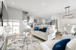 Bright and open extra-wide CORNER townhouse with plenty of natural light! With ultra-low strata fees, this beautifully maintained 4 BED 4 BATH air-conditioned home offers three bedrooms upstairs, including a spacious primary retreat with spa-inspired ensuite, a full laundry room, and two additional bedrooms that both easily fit queen beds. On the entry level, enjoy a flexible space with a bedroom, full bath, office/den, and its own separate entrance to the backyard—ideal for guests or extended family. The main level boasts a chef’s kitchen with a huge island that flows seamlessly to the dining and family areas, perfect for gatherings, plus a second living room over 300 sq. ft. The lower level offers an oversized TWO-car garage with plenty of storage.