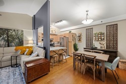 Welcome to Westside Estates - This updated and spacious top-floor 2 bed, 2 bath home offers 1,081sqft. of living with up to 12' vaulted ceilings, oversized windows, and a peek-a-boo mountain view. The bright living room includes a cozy fireplace, and the kitchen comes with updated appliances and plenty of counter space perfect for everyday living and entertaining. The generous primary bedroom easily accommodates a king size bed, features a walk-through closet leading to a private ensuite. Situated on the quiet side of the building, the unit includes two parking stalls and a same floor storage room for ultimate convenience. Located just steps from restaurants, local breweries, Willowbrook Shopping Mall, and the future SkyTrain, this home combines comfort, space, and an unbeatable location!