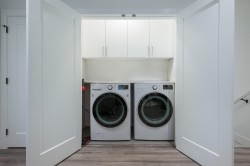 Exceptionally built END-UNIT ROWHOME by North Arc Properties with NO STRATA FEES. This spacious & meticulously maintained home shows like new and offers extensive upgrades throughout. Enjoy A/C, a chef-inspired kitchen w/ wine fridge and Fisher & Paykel appliances complemented by high-end finishes throughout. The professionally finished basement is ideal for guests or entertaining, showcasing a custom bar w/sink, wine storage, cabinetry & bar fridge, plus a developer-installed soundproofed bedroom. Well-sized bedrooms with potential to add 5th bedroom upstairs. Enjoy year-round outdoor living on the covered deck with gas BBQ hookup and custom awning. Rare 4-vehicle parking with double garage (epoxy floors) plus parking pad. A standout home offering privacy, space and luxury without strata.