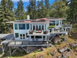 Commanding 180° southern ocean views, this 4,242 sq. ft. custom estate sits on 10 acres between Vancouver and Victoria. A brand-new Wolf kitchen, three ensuite bedroom retreats, executive office, and solar-forward design showcase luxury and sustainability. Expansive 2,200 sq. ft. decks frame whales, eagles, and endless sunsets. A secondary drive leads to a future guest cottage site. Rarely does a property combine architectural distinction and world-class views at this scale. Come Feel the Magic!