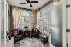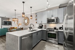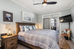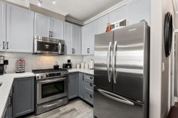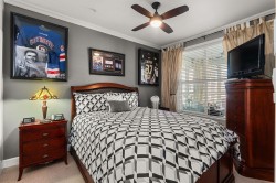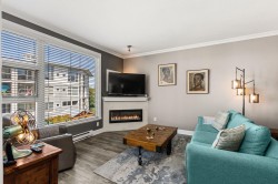 Stunning Coppery Sky Apartment! This gorgeous & spotless 2 bed, 2 bath, den & separate laundry/pantry room has 1,088 sq ft unit w/ updates throughout – BONUS 3 PARKING STALLS! Both bathrooms updated: new floors (heated in ensuite w/ heated mirror & towel rack), tub & shower tile, vanities & fixtures. Step into an open kitchen w/ quartz waterfall counter & matching backsplash, S/S appliances incl French door fridge & gas stove & under cabinet lighting and enjoy engineered flooring throughout w/ carpet in the bedrooms. Updated light fixtures throughout, wide open dining/living space with custom fireplace & quartz surround awaits with an expansive covered balcony with views to the river. Steps to the boardwalk & sunsets, minutes to Steveston Village, & dyke trails beyond.