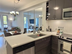 Experience spacious living in the heart of Surrey at The Verve! This bright 1-Bed + Large Den (719sqft) features 9' ceilings, a modern kitchen with quartz counters, full-size stainless steel appliances, large island with breakfast bar, and under-cabinet lighting. The oversized bedroom includes his & her closets and dual-access bathroom. Enjoy in-suite laundry and a west-facing balcony perfect for relaxing or BBQs. Includes 1 underground parking & storage locker. Building amenities: gym, yoga, billiards lounge, guest suite, and secure entry. Steps to King George SkyTrain, SFU, Central City Mall, parks, hospitals & restaurants—must see! Open House: Sat. & Sun (Nov.15&16) 2-4pm.