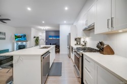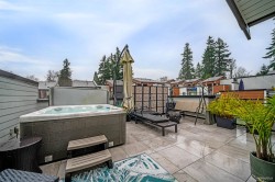 This stunning 3-bed + den end unit at Berkeley Village offers over 1,500 SF of bright, modern living space. This corner unit provides extra privacy and natural light, complemented by a superior side-by-side double garage. The gourmet kitchen features a large quartz island, gas cooking, and high-end S/S appliances. The flexible layout showcases an open-concept main floor with a dedicated den space. Luxury finishings include polished quartz surfaces and contemporary fixtures throughout. The massive rooftop patio is a true extension of the home, featuring a hot tub and umbrella for year-round enjoyment. Pet owners will love the integrated "catio" (easily removable if not needed). Commuting is a breeze with quick access to Hwy 99 and the US border. Open Sat/Sun Dec 20/21 1-4pm.