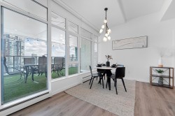 Experience one of the most exceptional 2-bedroom, 2-bath condos in the heart of Downtown Surrey. This luxurious home features soaring 12-ft ceilings and an expansive 1,200+ sqft. covered patio with premium artificial turf- perfect for outdoor living year-round. Perched on the northeast corner, this residence offers stunning panoramic views of the city skyline and Mount Baker. Truly one of a kind- there's simply no comparison. Located in vibrant Surrey Central, amenities including the "One Club" on the 44th floor, featuring breathtaking 360° views, a fully equipped fitness centre, business lounge, party room, and dedicated dog run. Perfect for downsizers or anyone seeking refined urban living, this home includes one parking stall and two oversized lockers. Book your viewing today.