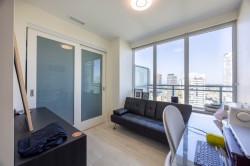 Subpenhouse Corner unit with views of city and mountain. This rarely available SOUTHEAST facing 2 bedroom 2 bath units has functional layout, laminate flooring through out, wrap-around big balcony, and high ceiling. Steps to skytrain station, SFU campus, KPU campus, library, city hall, shopping, restaurants and a lot more. This AIR CONDITIONED concrete high-rise building offers over 14,000 sf of indoor/outdoor amenities: outdoor courtyard with a children's play area, rooftop patio, social area, two-level fitness facility, co-working space, indoor lounge, social kitchen, dining area, games and media room, parcel room, dog wash and run area.1 PARKING + 1 STORAGE LOCKER