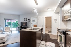 CALERA upper unit with easy access to shopping, schools, transit, restaurants! This beautifully kept unit features an open concept floor plan, quartz counter tops and kitchen with island and low maintenance laminate floors. Bonus space of the den, it makes it the perfect "work from home" office or quiet reading area! The private patio overlooks the fabulous walkout/secured courtyard and well maintained garden. The complex offers it's own exercise room and rec room with movie theatre. 1 underground parking stall and 1 storage locker rounds out this fantastic unit.