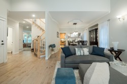 Immaculate 6-bed + den, 5-bath executive residence in coveted Heritage Trails. Fully transformed in 2016 with gourmet kitchen featuring quartz counters, extended island, natural stone floors & backsplash, plus $25K hardwood throughout main. Cozy family room boasts new $7K Napoleon fireplace & custom built-ins. Freshly painted inside/out, new carpets, crown molding, all door hardware, front door & garage door. Treated cedar roof (2023), newer high-efficiency furnace, new ensuite shower, new dishwasher. Bright 1400sq ft 2 bedroom basement suite, full bath & brand-new washer/dryer. Expansive 200sf front porch, low-maintenance paved backyard with new laurel privacy hedging. Top-ranked Semiahmoo Trail Elem & Secondary just steps away. Perfect family home with a mortgage helper suite included.