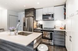 Welcome to this beautifully designed south-facing 1-bedroom suite, offering 628 sq. ft. of bright and open living space. Flooded with natural light through large windows and enhanced by high ceilings. The modern kitchen features sleek stainless steel appliances, elegant quartz countertops, and plenty of cabinetry for storage. Additional highlights include one secure parking stall and a convenient storage locker. A perfect combination of style, comfort, and functionality — ideal for first-time buyers or investors.