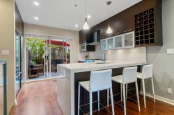 Welcome to CANVAS where contemporary design meets the vibrant energy of Kitsilano. This 1,589 sqft 3 bed + den corner unit townhouse blends modern design with functional living. The open-concept main floor features overheight ceilings, hardwood floors, floating stairs, a sleek kitchen with breakfast bar, and a sunny south-facing patio with natural light flowing through windows on 3 sides. Upstairs offers a bedroom + open den (which can be converted to a 4th bedroom), cozy fireplace, full bath, and laundry. The top floor is a private primary suite with walk in closet, spa-like ensuite, and sundeck. The lower level includes a flex space with custom California closet & desk—perfect for a guest room, office, or gym. Complete w/an attached garage + 2nd parking.