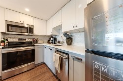 Beautifully updated top-floor 1 bed, 1 bath home with stunning views of the city, Lions Gate Bridge, Burrard Inlet & mountains. Enjoy sunsets from your west-facing balcony or entertain around the large kitchen island featuring stone-look counters, new appliances & sleek hex tile backsplash. Spacious layout fits a king bed, plus a stylish bath with walk-in shower & gold accents. Steps to brew pubs, markets, coffee shops & parks. Includes 1 parking & 1 storage.