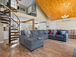 Custom contemporary chalet style home on 1.49 landscaped acres with panoramic views of the Stewiacke River Valley. This 2-bedroom, 2-bath property offers an open-concept design with vaulted pine ceilings, a cozy fireplace, and efficient in-floor heating with ETS unit. The lofted primary suite features a walk-in closet and ensuite, while the main level provides an accessible bedroom, full bath, and laundry. Outdoors, enjoy a level backyard with a gazebo, shed, and a 22’ x 24’ insulated, heated garage, perfect for projects or storage. Relax and take in the tides, watch eagles soar, or garden in your private outdoor oasis. The new culvert ensures ease of access. Just 5 minutes from Hwy 102, this home offers the ideal balance of tranquility and accessibility. Many recent upgrades including new steel roof on house & garage, door's & windows. UV purification system Dual Head Ductless heat pumps and electric hot water in floor radiant heat with and ETS on the main level