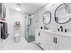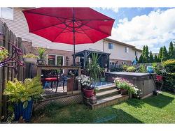 Gorgeous, professionally updated freehold townhome across from a Conservation Area with a number of paths and ponds for the enjoyment of nature lovers and dog enthusiasts. There is 1890 sq ft on the main and second floors, and almost 2700 sq ft of finished living space total. Inviting backyard with a deck, gazebo, 5-person hot tub, and lovely, mature greenery. Open concept main floor features hardwood flooring in the large living room with a gas fireplace, and in the dining room there are sliding doors to a deck. A stunning kitchen includes a gas stove, granite counter tops, a gorgeous tile backsplash and a breakfast/entertainment bar. The finished basement features luxury vinyl flooring, built-in custom wall-to-wall cupboards and drawers with bar fridge and a wet bar/refreshment area. Cabinetry surrounds an area for a wall mounted TV of up to an 85” with electric fireplace below. The second floor includes feature décor walls, a loft area, engineered hardwood throughout, custom blinds and a convenient laundry room. The spacious primary bedroom has a large 4-piece ensuite and walk-in closet. The main bath has a walk-in shower and a modern, free-standing vanity with 2 under mount sinks. The bedroom that is used as an exercise room has a Murphy bed offering a multi-purpose room including a guest room, exercise room or office. The Murphy bed has a storage cabinet and a pull out side table. Insulated garage is ideal for hobbyists in winter. Updates include AC/Furnace/Roof, 2 bathrooms, kitchen, basement, and pot lights throughout 3 levels including bedroom closets. Walk to amenities, shopping and restaurants. Two-minute drive to a large dog park. Close to highway access. This home is turnkey so just move in and enjoy all that this home and area have to offer!
