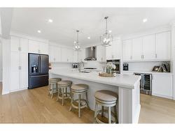 Welcome to 16 Festival Way, an executive residence featuring nearly 3,700 sq. ft. of luxuriously finished living space, set on a large, pool-sized, pie-shaped lot. Nestled in one of Binbrook's most prestigious courts, this exceptional 4 bedroom, 4 bath home effortlessly blends timeless elegance with modern sophistication. Step into the impressive 2-storey foyer, where wainscoting and herringbone tile set the tone for refined design. The open-concept main floor showcases natural white oak hardwood and crown moulding throughout, creating an inviting yet upscale atmosphere. At the heart of the home lies the custom chef-inspired kitchen, featuring an expansive 10-foot island, oversized cabinetry, quartz countertops, and top-of-the-line GE Café and Jenn-Air appliances. The adjoining living room centers around a custom tiled bio-ethanol fireplace, while the formal dining room, powder room, and laundry/mudroom complete this beautifully designed level. Beyond the 8-foot glass doors, your outdoor oasis awaits a custom stone kitchen with concrete countertops, built-in natural gas Napoleon grill, and a spacious covered patio with cedar ceiling & pot lights ideal for year-round entertaining. A massive stone fireplace adds warmth and ambiance, making this the perfect retreat for cozy evenings. The upper level continues to feature white oak hardwood floors and crown moulding, leading to four generous sized bedrooms. The primary suite is a true sanctuary, featuring a spa-inspired 4-piece ensuite and a custom-built walk-in closet designed for ultimate organization and style. The fully finished basement provides comfort and versatility, complete with plush designer carpeting, an open-concept media room with a 130" high-end projector screen and built-in surround sound system, plus an oversized gym with mirror wall, a 3-piece bathroom, and ample storage. This remarkable home is rare, combines luxury, craftsmanship, and thoughtful design inside and out.