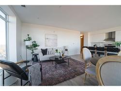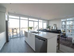Located in the heart of historic downtown Galt, this beautiful condo is part of the vibrant Gaslight District—a new center for residential, commercial, retail, dining, art, and culture. Here, life, work, and leisure come together to create an unparalleled living experience. This impressive unit has nine-foot painted ceilings, wide-plank light flooring, and premium finishes throughout. The spacious kitchen features modern cabinetry with designer hardware, quartz countertops, a tile backsplash, an oversized island with an under-mount sink and gooseneck faucet, and stainless steel appliances. The open-concept design flows seamlessly from the kitchen into a generous living and dining area, ideal for entertaining. Floor-to-ceiling windows and access to a large balcony let natural light flood the space. The primary suite offers his & her closets, glass doors leading to the balcony, and a luxurious four-piece ensuite with dual sinks and a walk-in shower. A second bedroom with floor-to-ceiling windows, a four-piece bath with a tub and shower combo, and in-suite laundry complete this premium unit. This condo also includes two parking spaces for your convenience. Residents enjoy access to an array of amenities, including a welcoming lobby with seating, secure video-monitored entry, a fitness area with a spacious yoga and Pilates studio, a games room with billiards, ping-pong, and a large TV, a catering kitchen, a private dining room, and a cozy library. The lounge opens onto a spacious outdoor terrace overlooking Gaslight Square, featuring multiple seating areas, pergolas, fire pits, and a BBQ area for outdoor relaxation.