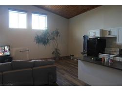 This spacious unit welcomes you with a large, private foyer that opens into a modern, open-concept kitchen complete with an island. The impressive living and dining area features elegant wood wainscoting and soaring vaulted ceilings, creating a warm and inviting atmosphere. A stylish 4-piece bathroom includes a convenient in-suite laundry station. The main floor offers a comfortable bedroom, while the upper level provides a private master bedroom retreat.
