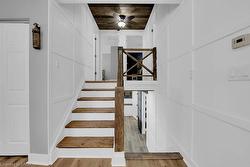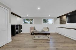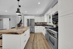 Welcome to this beautifully renovated 3-bedroom, 3-level side split home, ideally situated on a spacious corner lot. Combining modern elegance with rustic charm, this property offers the perfect blend of style, space, and functionality—ideal for families or anyone seeking a versatile home. Inside, luxury vinyl flooring flows throughout, creating a cohesive and durable foundation on every level. The heart of the home is a bright, open kitchen featuring a central island, sleek stainless-steel appliances, backsplash. Adjacent, the dining area opens via sliding doors to the backyard deck, seamlessly connecting indoor and outdoor living. The spacious living room is bathed in natural light from a large bay window and features a cozy electric fireplace, while pot lights throughout the main level enhance the inviting atmosphere, Inside entry from garage. A rustic staircase with panelled walls leads to three comfortable bedrooms. The primary suite has been newly renovated and boasts a wall-to-wall closet with barnboard doors, merging rustic charm with modern design, and a newly renovated 5-piece bathroom. The fully redone basement is a true highlight, offering a large recreation room perfect for family gatherings, hobbies, or entertainment. A dedicated office area provides an ideal space for remote work or study, and the laundry/mud room includes a convenient walk-up basement with a separate entrance—perfect for storage, added functionality, or private guest/in-law access. Step outside to your private country retreat. The backyard features a charming gazebo, a hot tub, a versatile workshop for projects and hobbies, and a thriving garden area ready for your green thumb. The driveway accommodates 10+ vehicles, large workshop 18.5 X 8.5 feet which you will appreciate. Recent updates include luxury vinyl flooring, renovated basement, primary bedroom, freshly painted interiors (2024), bath renovation (2025), built-in microwave, washer & dryer, and water heater owned (2023).