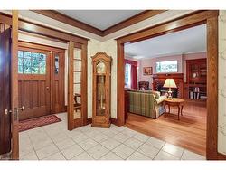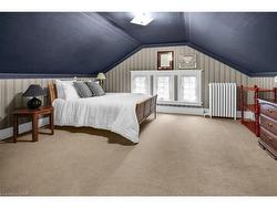 WELCOME TO ONE OF GRIMSBY’S MOST ICONIC HOMES —an extraordinary residence set on a spectacular 128 x 230-foot lot with direct access to Centennial Park, just a short walk to downtown and the highly ranked Nelles Public School, rated #1 in Ontario by the Fraser Institute. This stately all-brick 3-storey home has been lovingly maintained by the same family for over 41 years and offers 3,575 square feet of timeless charm, warmth, and architectural detail, including rich custom woodwork that greets you the moment you step into the grand center hall plan and wood-paneled den. The open-concept living and dining rooms feature recently updated hardwood floors and a cozy fireplace, creating the perfect setting for entertaining. At the heart of the home, the kitchen offers a breakfast bar, a butler’s pantry with built-in glass cabinetry, and a 2-piece powder room, all leading to a stunning 280 square foot sunroom with sweeping views of the beautifully landscaped grounds. Upstairs, the primary suite includes a private balcony with breathtaking Niagara Escarpment views, a 3-piece ensuite with soaker tub and heated floors, and is complemented by three additional spacious bedrooms, a modern 3-piece bathroom with glass shower, and convenient second-floor laundry. With two staircases, this level also offers excellent potential for an in-law suite. The third floor includes two more bedrooms and a large storage closet, while the lower level provides ample storage and a flexible recreation or fitness room. Completing this incredible offering is a 2,150 square foot, 2-storey carriage house or workshop, currently outfitted as a woodworking space with hydro and propane heat, and ideal for conversion into an accessory dwelling unit (ADU) or potential back lot severance. The exterior features manicured gardens, a tranquil waterfall feature, and a double detached garage. This is a rare opportunity to own a landmark property that seamlessly blends historic elegance with modern convenience.