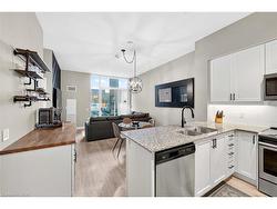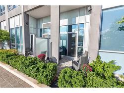 Welcome to Art on Main this ground floor condo offers the rare convenience of direct outdoor access and a private patio with a gas hookup, perfect for barbecuing and enjoying fresh air right from your suite. Featuring 10-foot ceilings and floor-to-ceiling south-facing windows with privacy film, the open-concept layout includes a king-sized primary bedroom, a spacious den with doors that can easily serve as a second bedroom or home office, and a stunning kitchen with high-end stainless steel appliances, quartz countertops, and a custom built-in dry bar with a beautiful walnut waterfall counter and built-in beverage chiller. Thoughtfully upgraded space with modern lighting, hardware, in-suite laundry, and a full 4-piece bathroom, this suite combines style and functionality. Residents enjoy access to premium amenities including a heated outdoor pool, fitness centre, rooftop terrace, party room, pet spa, guest suite, games room, library, and visitor parking. Ideally located across from the Milton Public Library, with parks and sports fields nearby, and just minutes from the GO Station, hospital, schools, downtown shops, restaurants, and highway access.