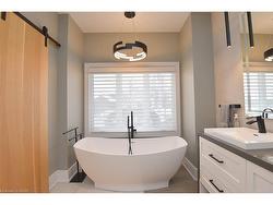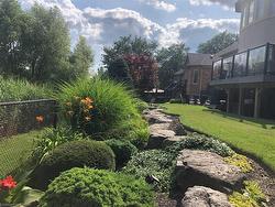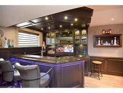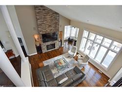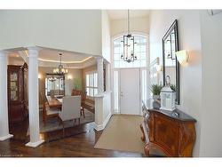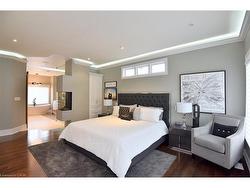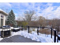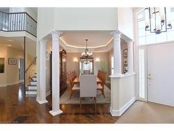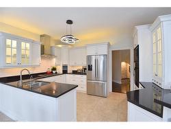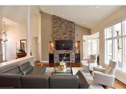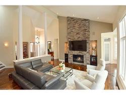 Tucked away in one of Waterdown’s most desirable neighbourhoods, this executive Vanhoeve built home blends luxury with nature, backing onto a serene ravine. The professionally landscaped yard feels like a private oasis, showcasing a stamped-concrete patio with a custom gas fire pit, a rebuilt composite deck framed by a sleek glass railing, and peaceful, tree-lined views that invite you to unwind. The curb appeal is equally striking with refreshed stucco and a beautifully stamped-concrete driveway and walkway.Inside, the main floor master suite is nothing short of spectacular—anchored by a three-sided wall-hung gas fireplace and complemented by a spa-worthy ensuite featuring a soaker tub, walk-in shower, heated floors, and exquisite slab sliding doors. The living area impresses with vaulted ceilings and a floor-to-ceiling stone fireplace that draws your eye to the stunning ravine backdrop. A stylish dining room, private main-floor den, entertainer’s kitchen, and convenient laundry make main-level living effortless.Upstairs, the loft offers two inviting bedrooms and a gorgeous walk-through bathroom. The fully finished basement transforms into an entertainer’s haven with a custom bar by The Bar Shop, complete with a dishwasher, sink, bar fridge, and convection microwave. The mirror-TV adds a touch of magic, creating the perfect setting for game nights and gatherings. Every corner of this home showcases exceptional craftsmanship and thoughtful detail. Come see this marvelous home for yourself today...you will be glad you did!