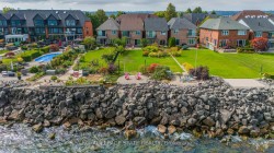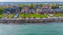 Experience unparalleled lakefront living with this exceptional property, offering breathtaking vistas from nearly every room. Perfectly positioned within the prestigious Newport Yacht Club community, this home provides the rare convenience of mooring a boat just steps from your front door, along with effortless QEW access for commuting. This "linked" townhome lives like a detached home, sharing no common walls and boasting parking for six vehicles, including a full double garage. The open-concept main level is a showcase of style and comfort, featuring an updated kitchen with new quartz counters, crown molding, gleaming hardwood floors, a gas fireplace, and a separate dining room. Step through sliding doors to an oversized patio that stretches across a meticulously landscaped 100-foot yard, leading to a private waterfront patio where you can watch the sun rise or set over Lake Ontario. Upstairs, you'll find three generous bedrooms plus a home office, bedroom-level laundry, second gas fireplace in primary suite and two fully updated bathrooms. The primary suite opens onto a balcony where the panoramic lake and Toronto skyline views are simply unforgettable. Notable updates include new counters, sinks, faucets, roof, furnace, AC, light fixtures, and window treatments. A finished lower level with a walk-up to the yard adds even more living space. Rarely available, this is a truly special opportunity to secure a piece of Lake Ontario's waterfront-an address where every day feels like a getaway.