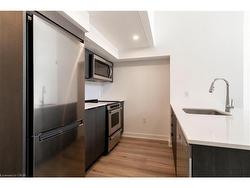 Live à la Moda—where style meets substance in this brand-new, never-lived-in double-height loft with soaring 15-ft ceilings and a polished concrete feature wall. Bathed in natural light through full-height black-framed windows, this industrial-chic unit offers a mezzanine bedroom, stylish modern kitchen with quartz counters and stainless steel appliances, and a spacious open-air terrace with natural gas hookup—perfect for grilling and entertaining. Step inside a thoughtfully designed residence boasting luxury vinyl-plank flooring, an in-suite laundry pair, sleek designer lighting, and a private entrance with secure underground parking included. This ground-floor loft is one of the most striking layouts in the building, with a sophisticated edge. Located just 3 minutes from the University of Waterloo and close proximity to Uptown, Laurier, Waterloo Rec Complex, and The Hydrocut trail system, this location supports a dynamic, active lifestyle. With many bike routes close by, secure bike parking, and an on-site bike maintenance station, it’s built for those who move. Amenities include a curated co-working lounge with coffee bar and meeting pods, pet wash station, EV-ready parking, secure parcel room, and available storage lockers—blending convenience and community under one stylish roof. Welcome to Moda Modern Loft Living.